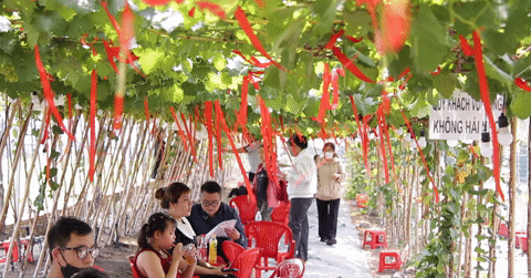 Trước đó, mô hình trồng nho phục vụ khách tham quan đã được triển khai ở TPHCM. Để tạo điểm khác biệt, anh Hồng thiết kế khu vườn thành quán cà phê, phục vụ các món ăn đặc sản của vùng đất Ninh Thuận (cũ) như: mật nho, bánh canh chả cá, gỏi cuốn chả cá…