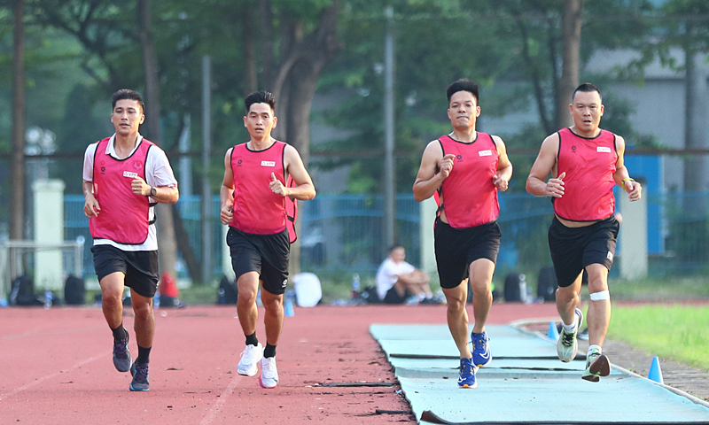 Các trọng tài kiểm tra thể lực trước V-League 2025-2026 tại Cung điền kinh Hà Nội ngày 3/8/2025. Ảnh: VFF