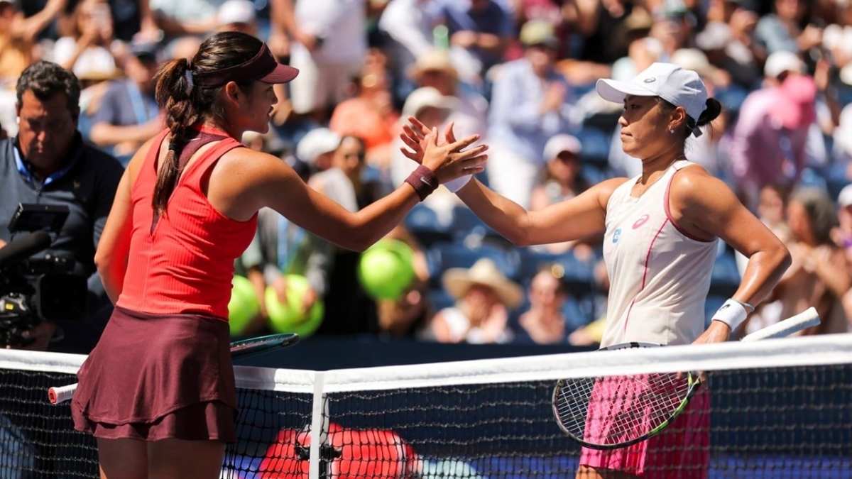 Raducanu (trái) bắt tay Tjen sau trận đấu trên sân Louis Armstrong, New York, Mỹ hôm 27/8. Ảnh: Reuters