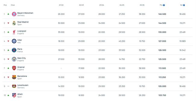 Hành trình của Bayern Munich vẫn chưa dừng lại khi họ còn cơ hội vào chung kết nếu vượt qua Paris Saint-Germain. Trong khi đó, Barcelona tiếp tục đứng ngoài cuộc đua top đầu khi chỉ xếp thứ 8 với 113,2 điểm, cho thấy khoảng cách đáng kể với hai ông lớn kể trên.