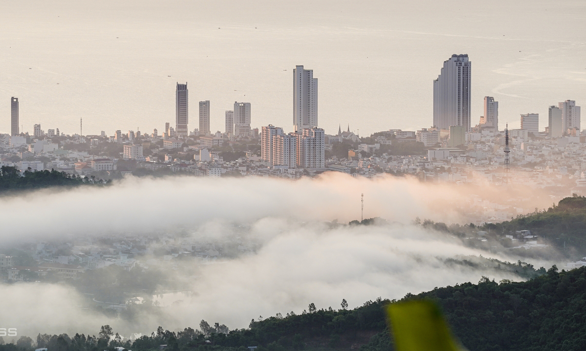 Trung tâm phố biển Nha Trang nhìn từ trên núi, xen lẫn các lớp mây “tràn liên tục” tại các ngọn núi.