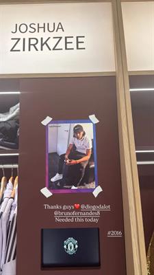 Không chỉ dừng lại ở việc tìm được ảnh cũ, một vài thành viên trong đội còn quyết định “chơi lớn” khi in và dán thẳng bức hình đó lên tường trong phòng thay đồ. Tấm ảnh được đặt ngay cạnh tủ đồ của Zirkzee, trong bức ảnh khi ấy tiền đạo người Hà Lan ngồi tựa trên tay ghế sofa, đội mũ đen, mặc áo trắng, quần jeans rách và đi giày trắng, tạo dáng khá ngẫu hứng trước ống kính.