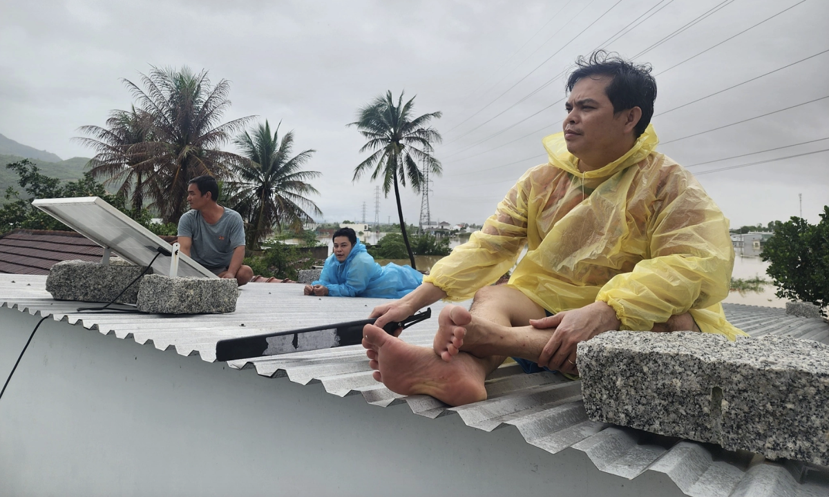Người dân phường Nam Nha Trang ngồi trên mái nhà chờ cứu hộ, sáng 20/11. Ảnh: Bảo Hòa