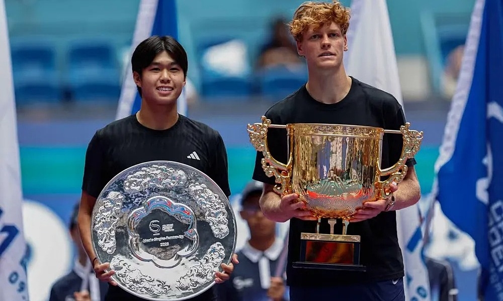 Sinner (phải) và Tien trên bục nhận giải ở sân Trung tâm, tổ hợp National Tennis Center, Bắc Kinh, Trung Quốc hôm 1/10. Ảnh: Reuters