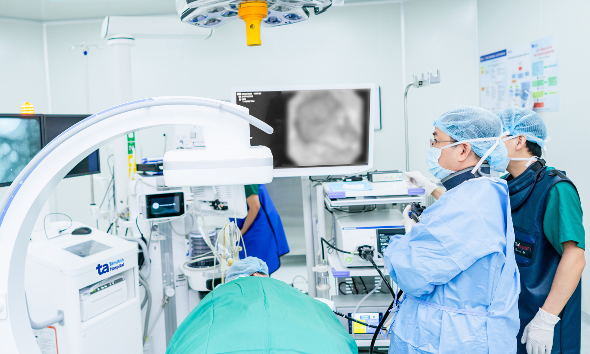 Bác sĩ Thanh Bình đang nội soi mật tụy ngược dòng lấy sỏi cho anh Giang. Ảnh: Bệnh viện Đa khoa Tâm Anh