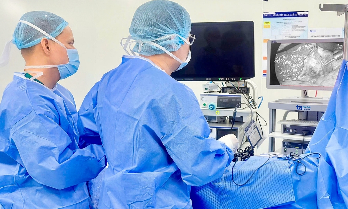 Bác sĩ Công Khánh (phải) phẫu thuật nội soi cắt túi mật cho anh Linh. Ảnh: Bệnh viện Đa khoa Tâm Anh