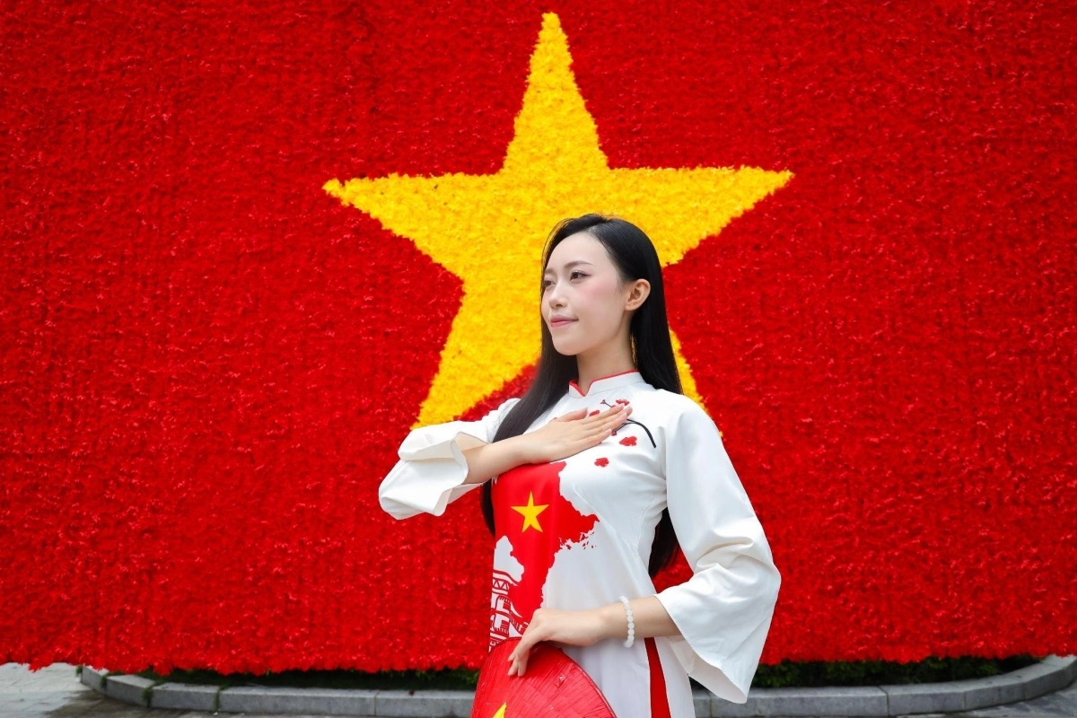 Nhiều du khách đến từ sớm để tận hưởng không gian lễ hội và ghi lại những khoảnh khắc đặc biệt. Điểm nhấn là bức đại kỳ lớn kết từ hàng nghìn đóa hoa đỏ và vàng, thể hiện tinh thần tự hào dân tộc.