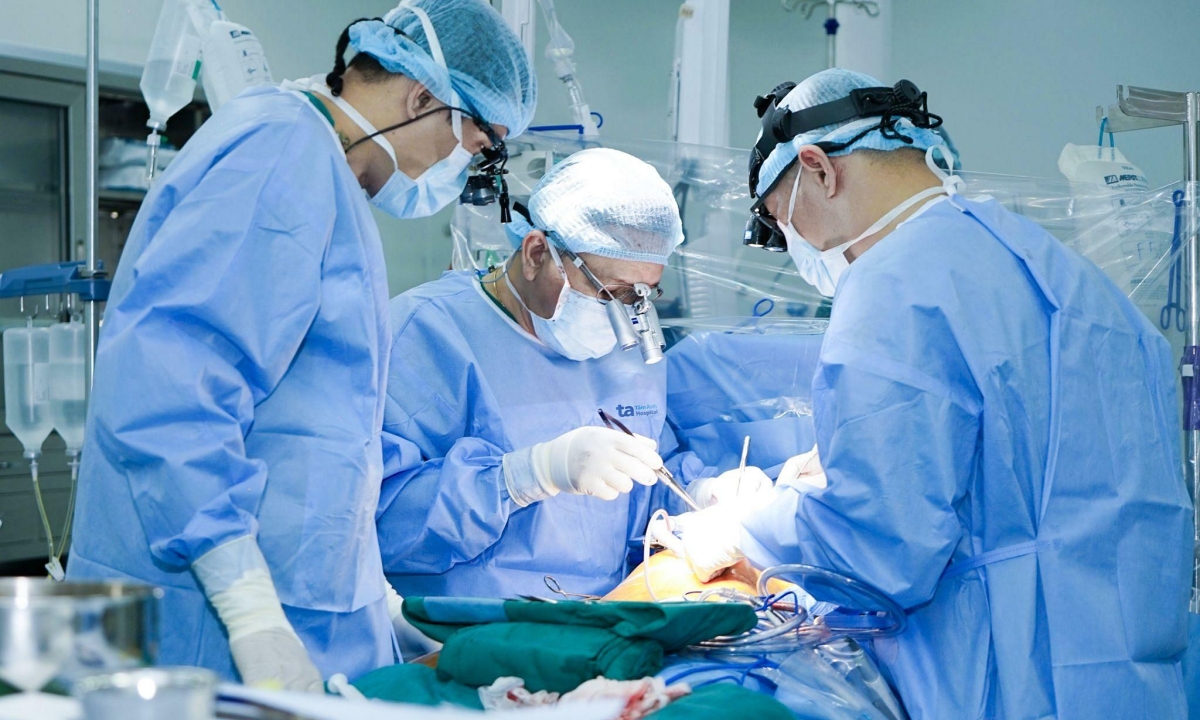 Bác sĩ Khang (giữa) cùng ê kíp phẫu thuật bắc cầu mạch vành cho bệnh nhân. Ảnh: Thanh Luận