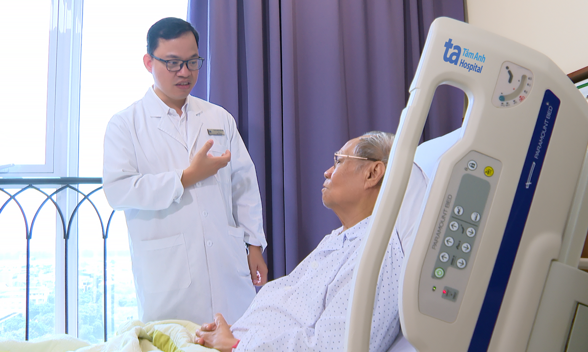 Bác sĩ Long dặn dò người bệnh trước khi xuất viện. Ảnh: Bệnh viện Đa khoa Tâm Anh