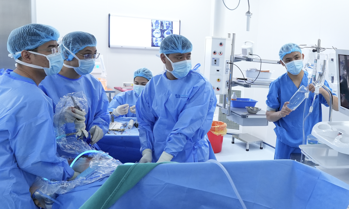 Bác sĩ Hiếu phẫu thuật tái tạo đa dây chằng cho bệnh nhân. Ảnh: Bệnh viện Đa khoa Tâm Anh