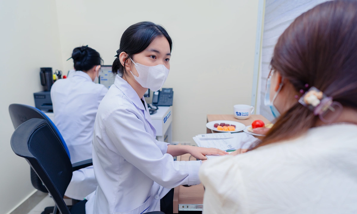 Chuyên viên dinh dưỡng tư vấn chế độ ăn giảm cân cho chị Thúy. Ảnh: Bệnh viện Đa khoa Tâm Anh