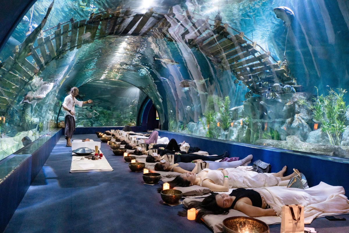 Hà NộiThay vì vào phòng tập, nhiều du khách trải nghiệm yoga dưới mái vòm của thủy cung, xung quanh là hàng nghìn sinh vật biển như cá đuối, cá mập bơi lượn.
