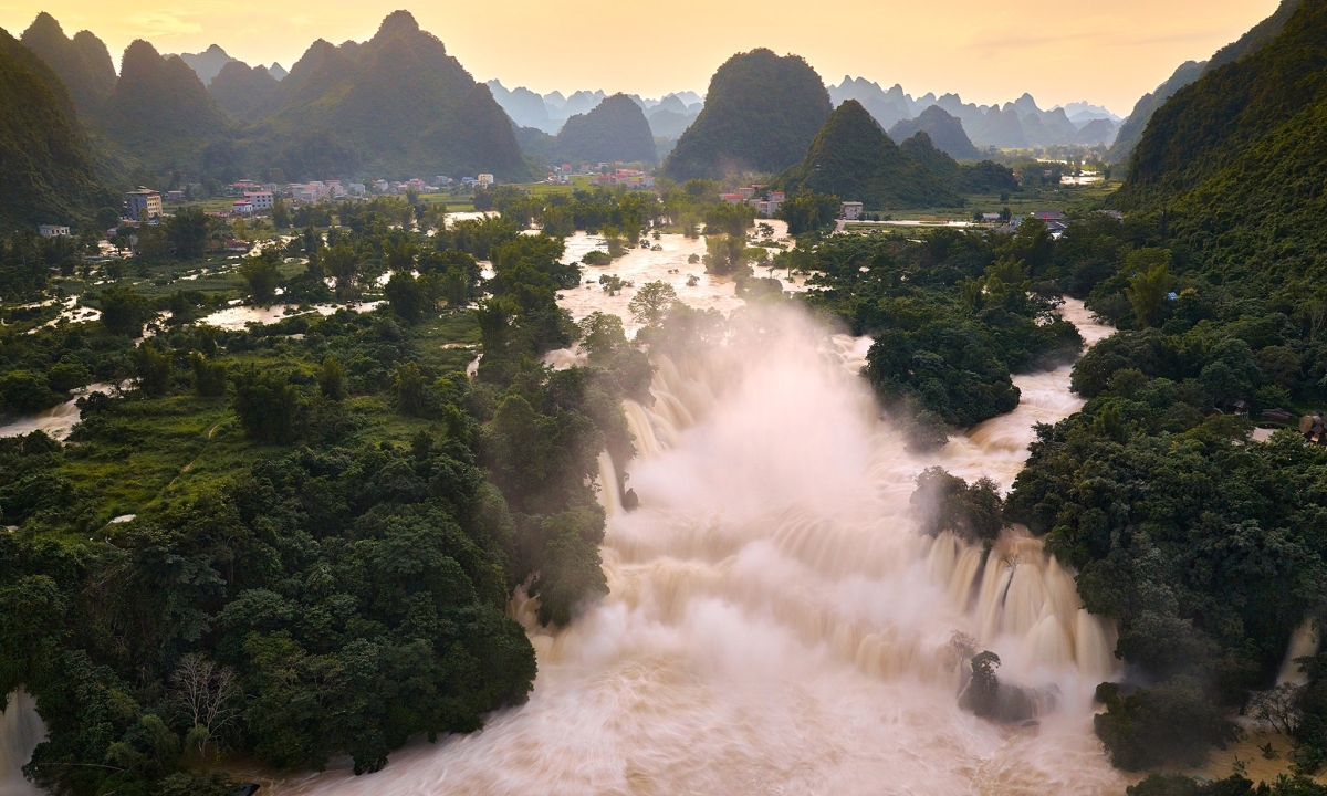 Thác Bản Giốc những ngày đầu tháng 10 biến thành dòng nước đục khổng lồ, trái ngược với khung cảnh trong xanh đặc trưng vào mùa thu, do ảnh hưởng của hai cơn bão liên tiếp.