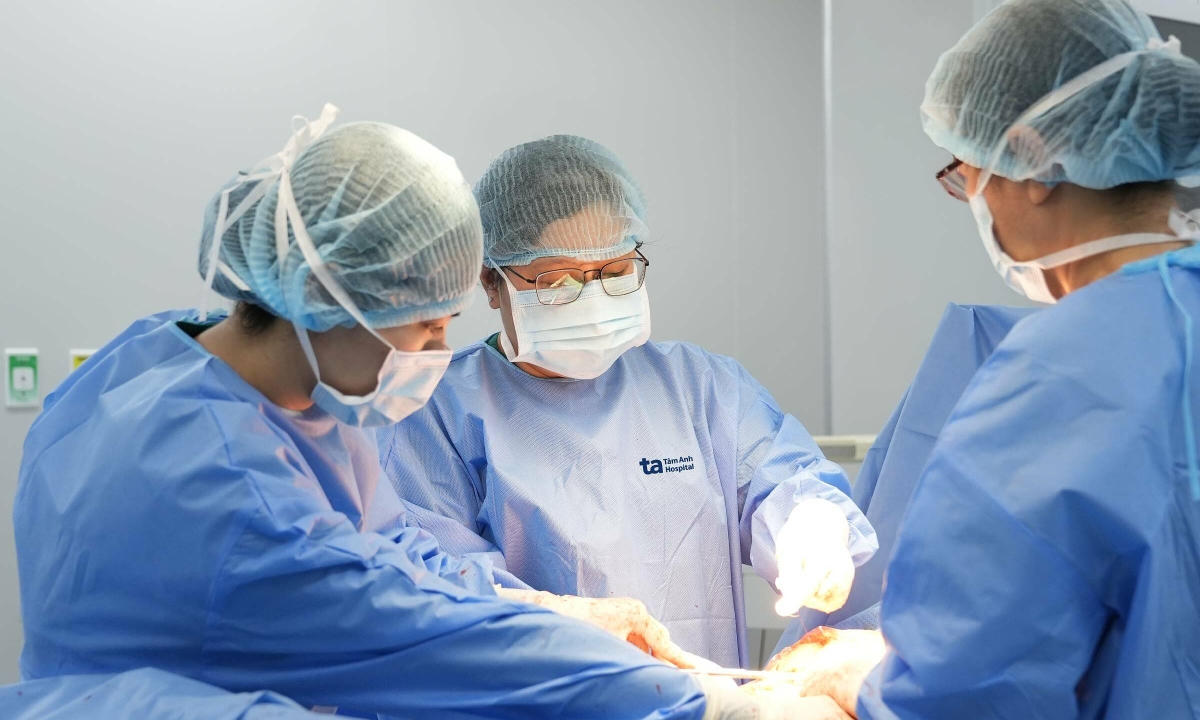 BS.CKII Nguyễn Ngọc Thoại (giữa) thực hiện ca mổ cứu thai nhi 37 tuần bị dây rốn thắt nút. Ảnh: Tuệ Diễm.