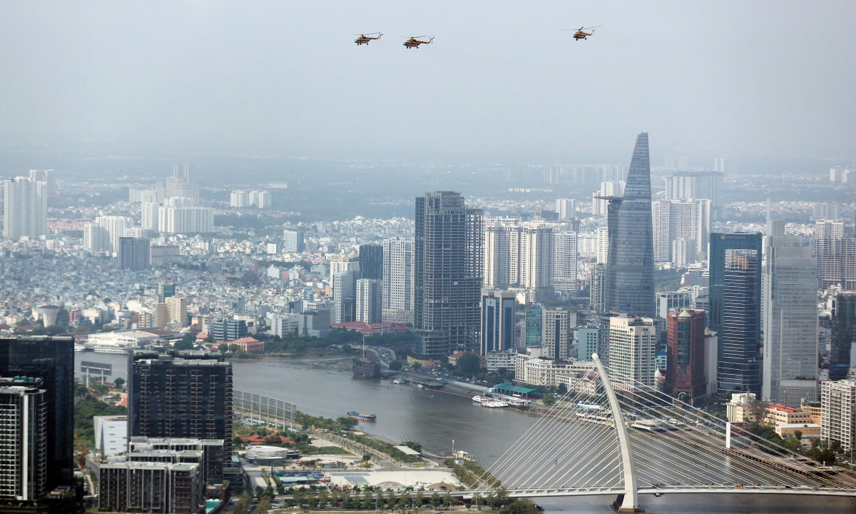 Trực thăng bay tập luyện ở trung tâm TP HCM chuẩn bị cho màn trình diễn dịp 50 năm thống nhất đất nước, sáng 27/3. Ảnh: Đức Đồng