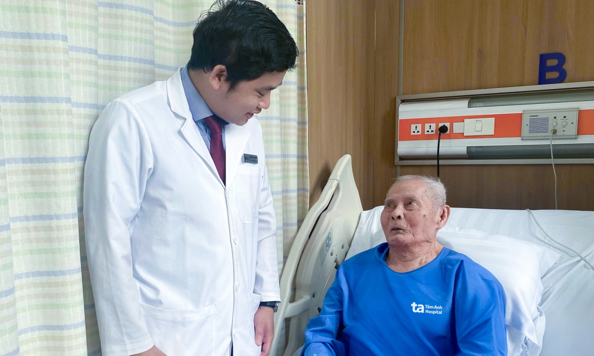 Bác sĩ kiểm tra sức khỏe của cụ Vĩnh trước khi xuất viện. Ảnh: Bệnh viện Đa khoa Tâm Anh