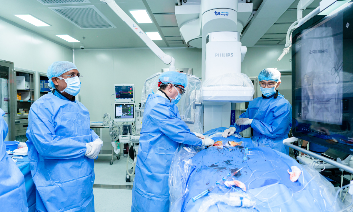 Bà Khánh bị hẹp van động mạch chủ nặng từ năm 2023, được bác sĩ chỉ định phẫu thuật thay van. Song, bà tuổi cao lại có bệnh đái tháo đường, tăng huyết áp, rối loạn mỡ máu, hẹp mạch vành nên từ chối mổ, mong muốn theo dõi nội khoa. Một tháng trước, bà mệt nhiều, nặng ngực khi gắng sức dù vẫn uống thuốc theo toa đều đặn. 10 ngày sau triệu chứng nặng dần, bà được thay van động mạch chủ qua ống thông (TAVI) tại một bệnh viện ở TP HCM nhưng không thành công nên sau đó được chuyển đến Bệnh viện Đa khoa Tâm Anh can thiệp lại.