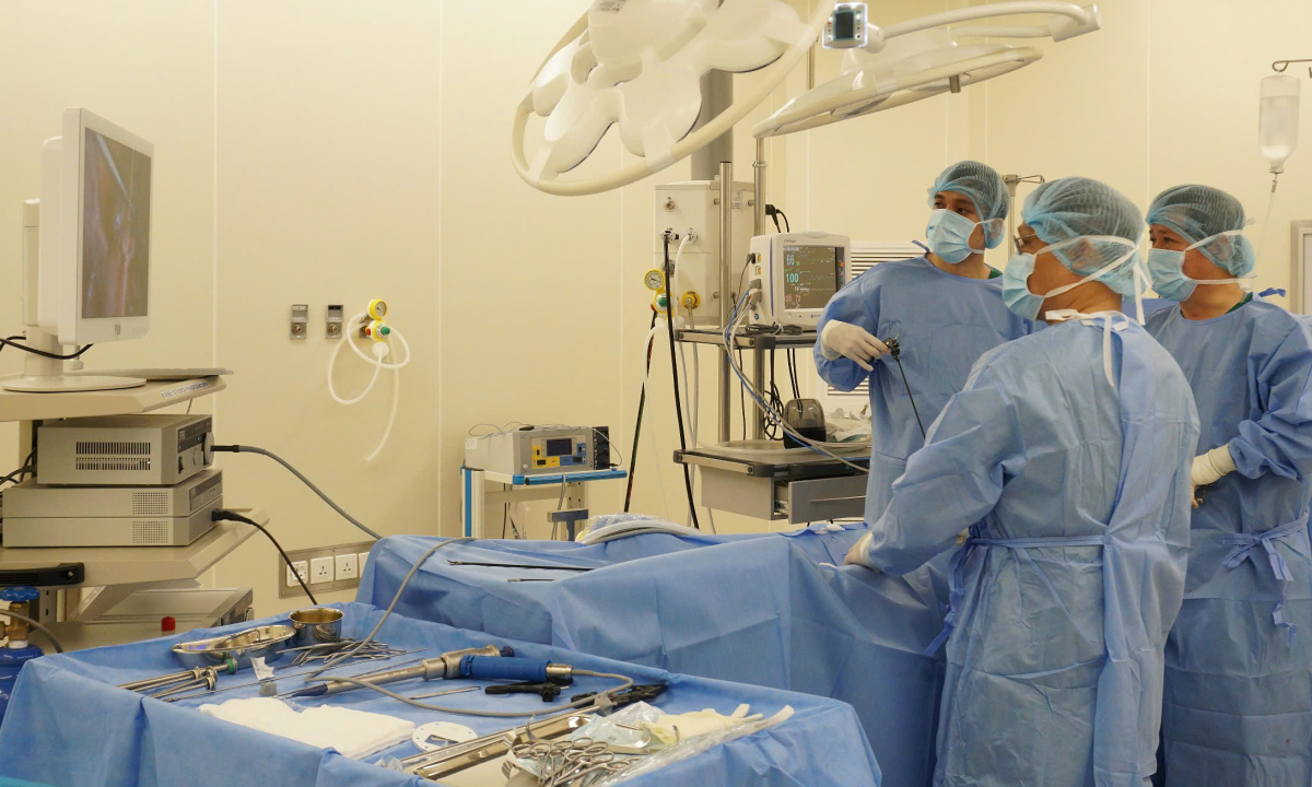 Các bác sĩ phẫu thuật nội soi cho bệnh nhân. Ảnh: Bệnh viện cung cấp