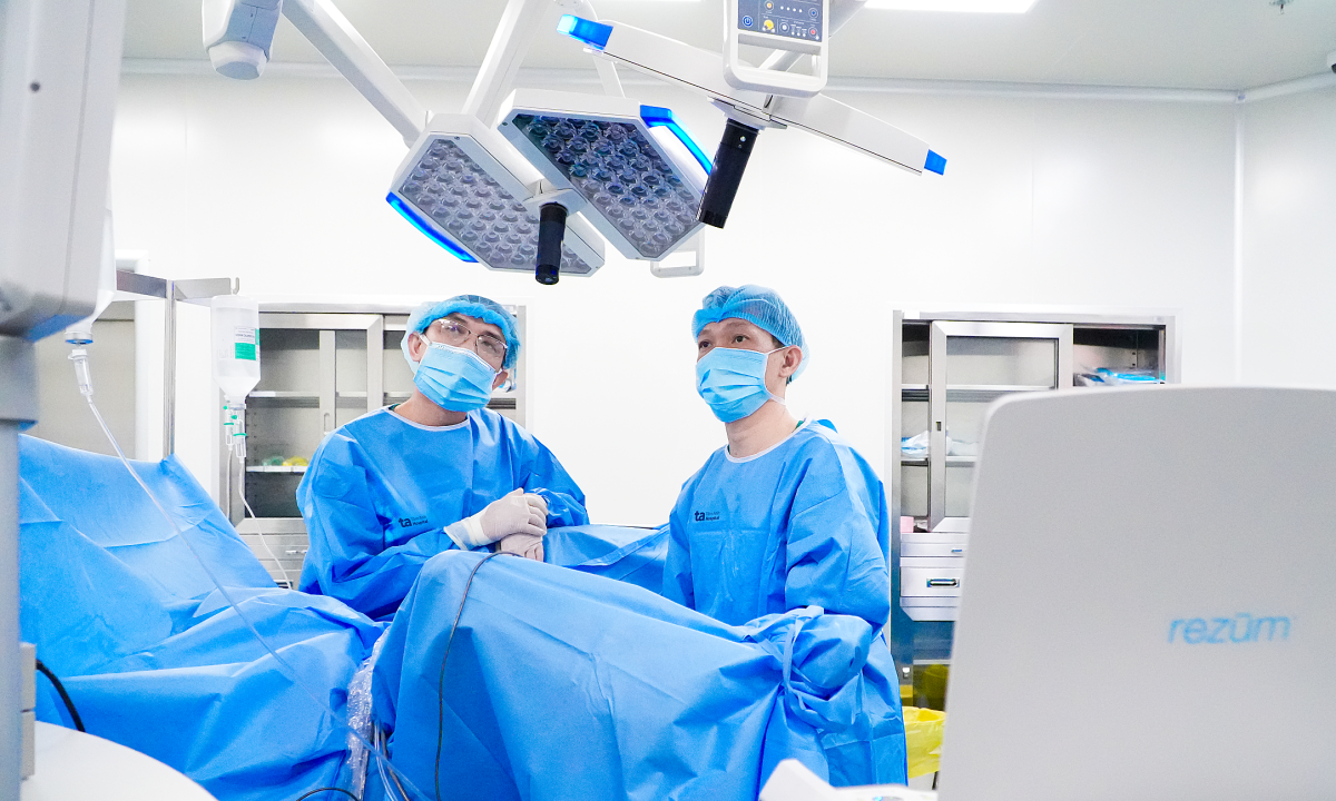 Bác sĩ Cương (phải) và ThS.BS Phan Đức Hữu sử dụng liệu pháp Rezum điều trị phì đại tuyến tiền liệt cho ông Phương. Ảnh: Bệnh viện Đa khoa Tâm Anh