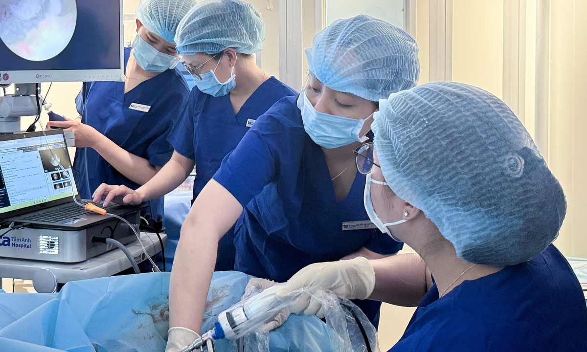 Bác sĩ Giang (ngoài cùng bên phải) nội soi buồng tử cung cho người bệnh. Ảnh: Bệnh viện Đa khoa Tâm Anh