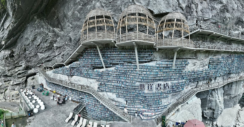 Bên trong hang, hàng nghìn cuốn sách thuộc nhiều thể loại được sắp xếp dọc theo vách đá, kết hợp cùng thiết kế gỗ mộc mạc, tạo nên không gian vừa giản dị vừa huyền bí. Ánh sáng tự nhiên từ cửa hang rọi xuống giá sách, trong khi những ban công nhỏ mở ra khung cảnh thung lũng rộng lớn phía dưới.
