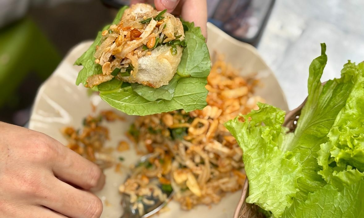 Bánh mì hấp cuốn cùng rau sống tương tự cách ăn bánh xèo. Ảnh: Hà Phương