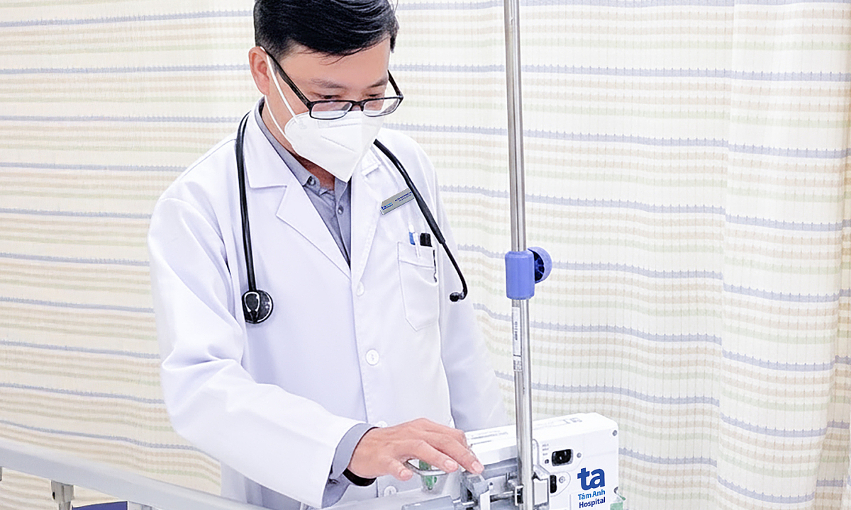 Bác sĩ Thiện điều chỉnh máy truyền thuốc cho người bệnh. Ảnh: Bệnh viện Đa khoa Tâm Anh