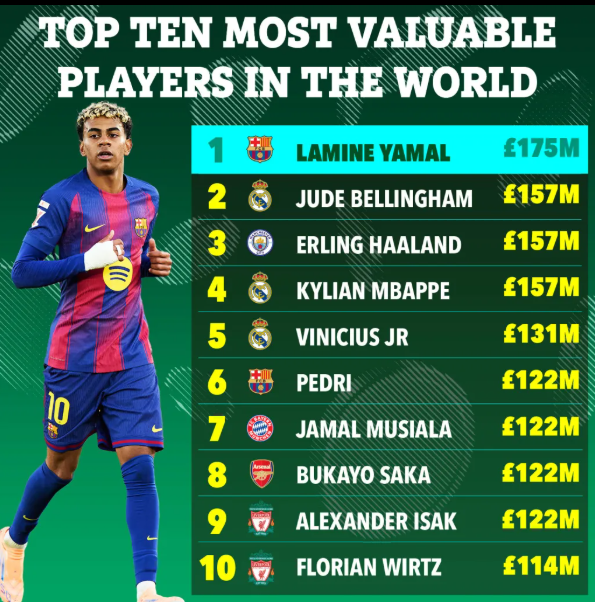 Theo sau cầu thủ trẻ này là bộ 3 Jude Bellingham, Erling Haaland và Kylian Mbappe. Họ được định giá ở mức 157 triệu bảng Anh, thấp hơn Yamal 18 triệu bảng Anh. Có một khoảng cách tương tự với Vinicius Jr đứng thứ 5, người được định giá là 131 triệu bảng Anh.