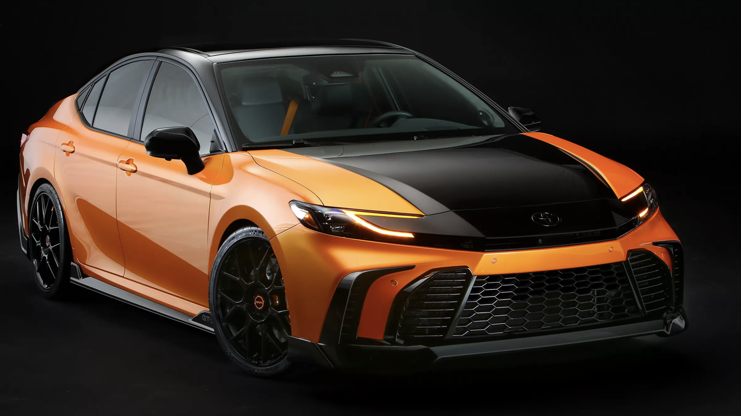 Về thiết kế, Camry GT‑S gây ấn tượng mạnh với phong cách ngoại thất cực kỳ hầm hố. Xe được trang bị bộ bodykit thể thao, bao gồm cản trước mở rộng, ốp sườn góc cạnh và phần đuôi có bộ khuếch tán giả tạo hình hốc gió hai bên. Một cánh gió lớn phía sau, kết hợp cùng phối sơn hai tông màu giúp tổng thể xe đậm chất xe hiệu năng cao. Thân xe sơn màu cam Inferno Flare nổi bật, trong khi phần mui, nắp ca-pô, mâm xe và chi tiết khí động học được phủ đen mờ tương phản.