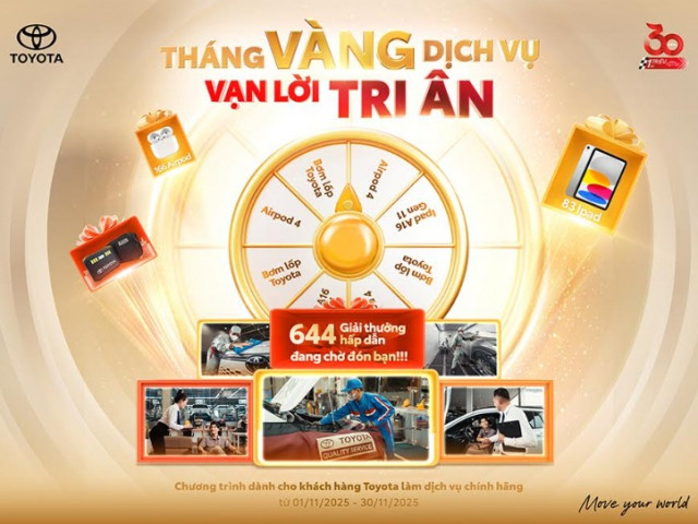 Với mong muốn tri ân khách hàng, Toyota Việt Nam triển khai chương trình khuyến mãi “Tháng vàng dịch vụ, vạn lời tri ân” dành cho tất cả các khách hàng làm dịch vụ tại hệ thống đại lý và trạm dịch vụ ủy quyền của Toyota Việt Nam trên toàn quốc.