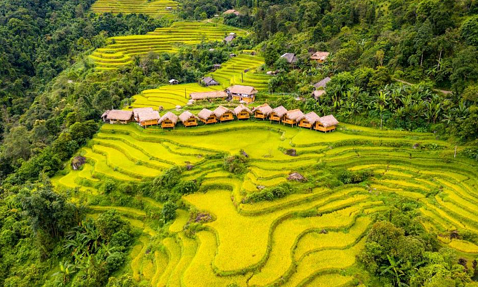 Panhou Retreat ẩn giữa không gian núi rừng và ruộng bậc thang. Ảnh: Khu nghỉ dưỡng