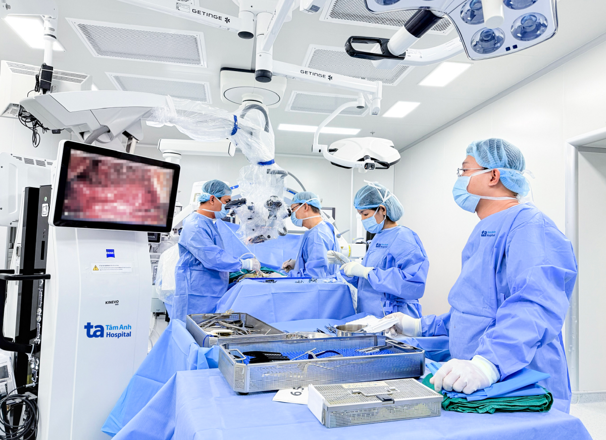 Bác sĩ phẫu thuật lấy u trong ống sống cho anh Nguyên với sự hỗ trợ của kính vi phẫu AI. Ảnh: Bệnh viện Đa khoa Tâm Anh