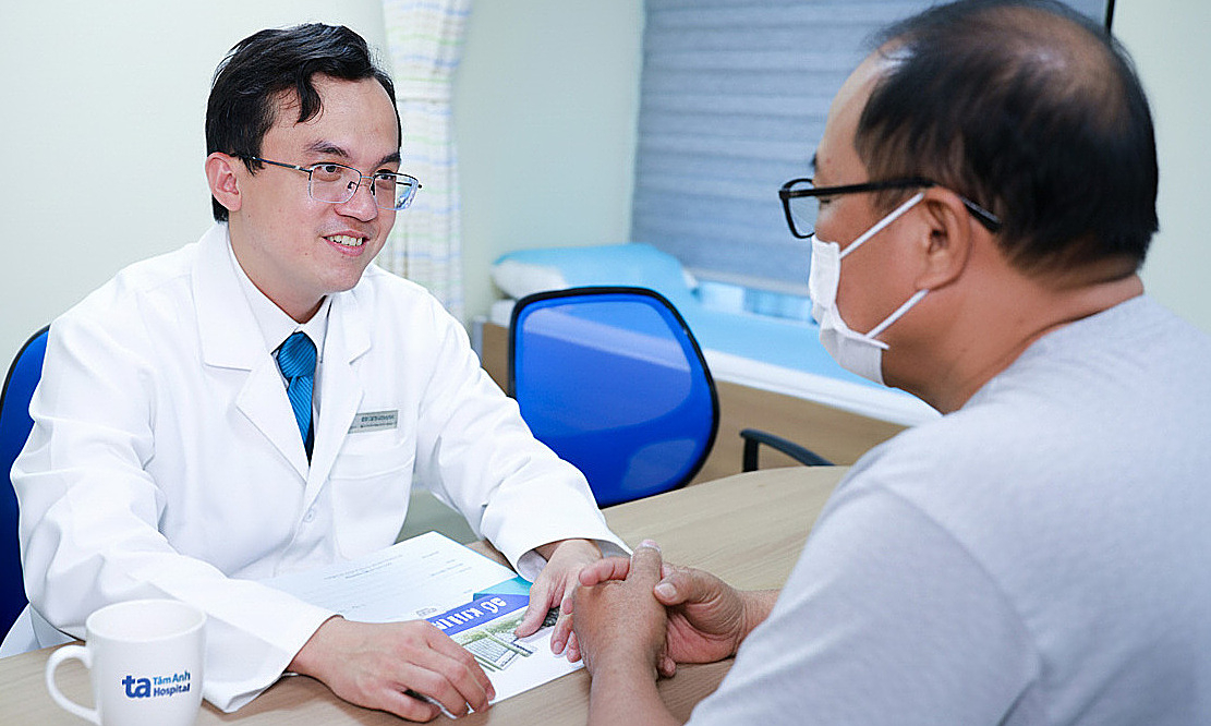 Bác sĩ Bảo tư vấn chăm sóc sức khỏe sau điều trị cho ông Thật. Ảnh: Phòng khám Đa khoa Tâm Anh Quận 7