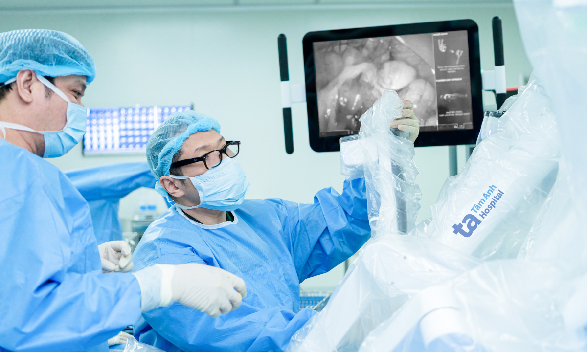 Bác sĩ chỉ định mổ lấy u cho anh Long với sự hỗ trợ của robot Da Vinci Xi nhằm tăng độ chính xác và kiểm soát các mạch máu tốt hơn. Bác sĩ điều khiển 4 cánh tay robot bóc tách vùng rốn thận, bộc lộ rõ động mạch, tĩnh mạch thận, bể thận, niệu quản. Qua hình ảnh 3D phóng đại, cánh tay robot xoay 540 độ giúp bác sĩ tiếp cận sâu vào vùng rốn thận chật hẹp, lách qua các mạch máu để tiếp cận và cắt bỏ khối u chính xác, ít chảy máu, bảo tồn mô thận lành cho người bệnh. Xét nghiệm mô học sau phẫu thuật cho kết quả ung thư như chẩn đoán ban đầu.