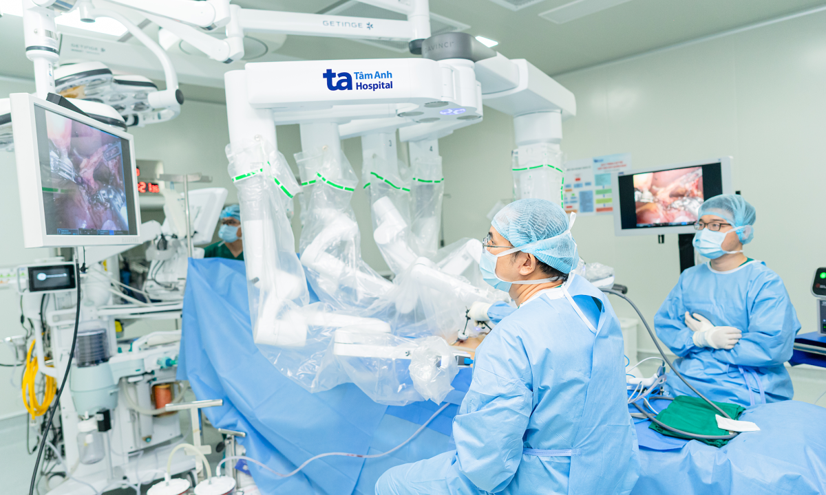 Một ca phẫu thuật nội soi có sự hỗ trợ của robot tại Bệnh viện Đa khoa Tâm Anh. Ảnh: Bệnh viện cung cấp