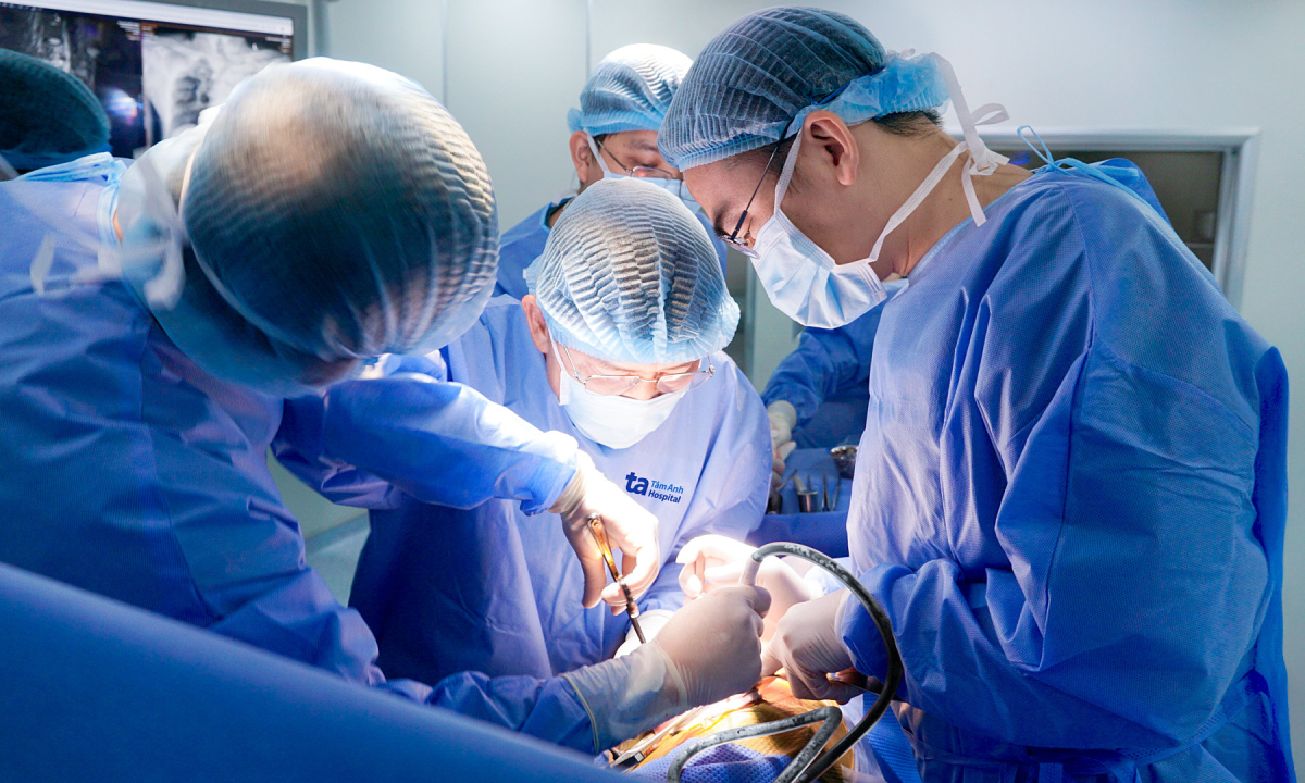 Bác sĩ Hiển (giữa) phẫu thuật giải ép, loại bỏ lao cột sống cho ông Niên. Ảnh: Bệnh viện Đa khoa Tâm Anh