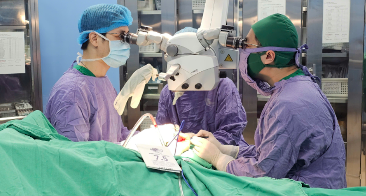 Ca mổ được triển khai với hai ê-kíp. Dưới kính hiển vi phẫu thuật, các mạch máu và thần kinh siêu nhỏ có đường kính chỉ 0,8-1mm được khâu nối chính xác bằng chỉ chuyên dụng, giúp phục hồi tưới máu cho phần chi gần đứt rời.