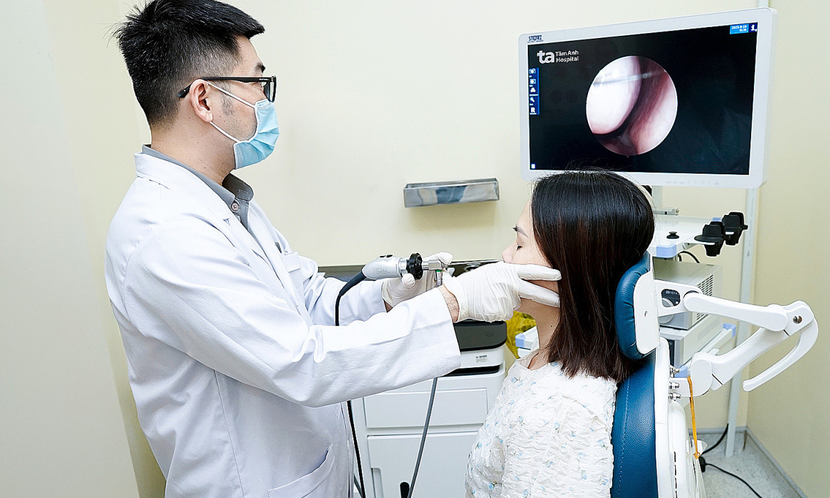 Bác sĩ Long đang nội soi mũi cho một người bệnh. Ảnh minh họa: Bệnh viện Đa khoa Tâm Anh