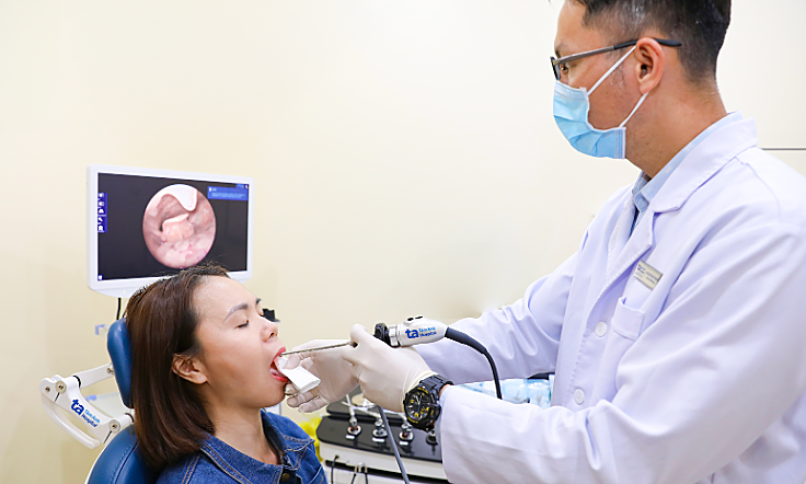 Bác sĩ Thạch đang nội soi họng cho một người bệnh. Ảnh: Phòng khám Đa khoa Tâm Anh Quận 7