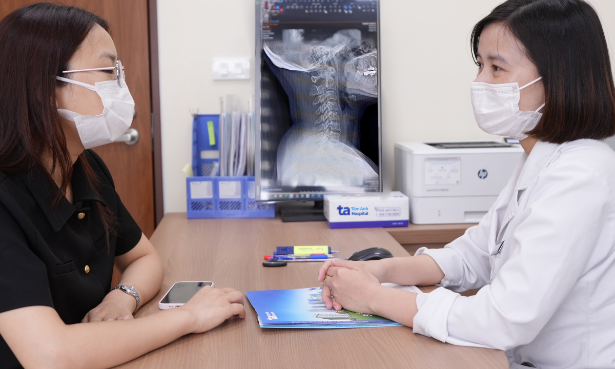 Bác sĩ Ngọc tư vấn cho bệnh nhân trẻ bị thoái hóa đốt sống cổ. Ảnh minh họa: Bệnh viện Đa khoa Tâm Anh