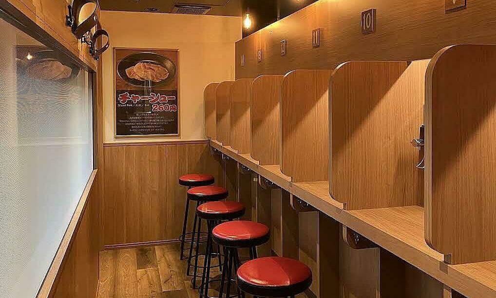 Việc ngồi đối diện với tường hoặc rèm phù hợp với mô hình dịch vụ nhanh, giống như dây chuyền. Các chỗ ngồi trong tầm tay của đầu bếp, thực khách sẽ được phục vụ trong khoảng 15 giây sau khi chế biến để giữ được độ dai hoàn hảo của sợi mì. Ngoài ra, đây cũng là thiết kế bắt nguồn từ các quầy ramen đường phố ở Fukuoka đã tồn tại từ lâu, nơi các quầy phục vụ nhanh, đơn giản khá phổ biến.