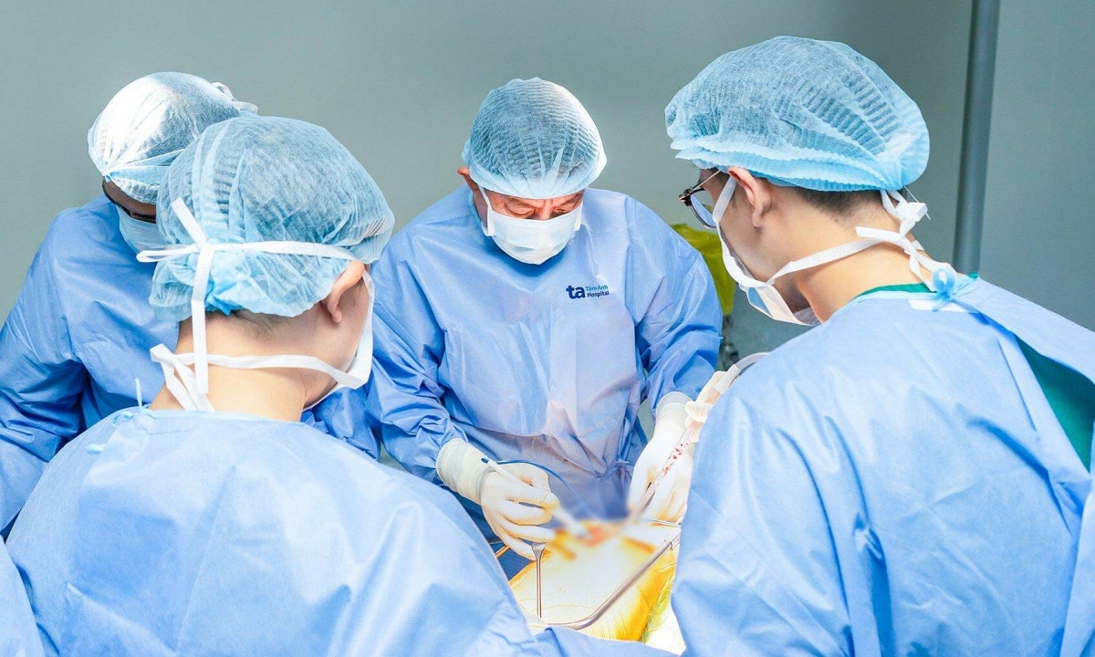 Bác sĩ Tuấn (giữa) đang phẫu thuật thay khớp háng cho ông Oai. Ảnh: Bệnh viện Tâm Anh