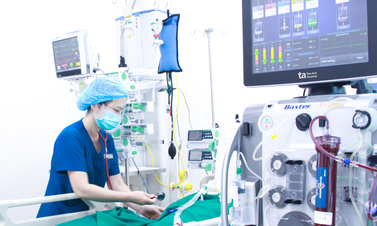 Người bệnh được lọc máu liên tục (CRRT) tại giường bệnh ICU. Ảnh: Bệnh viện Đa khoa Tâm Anh