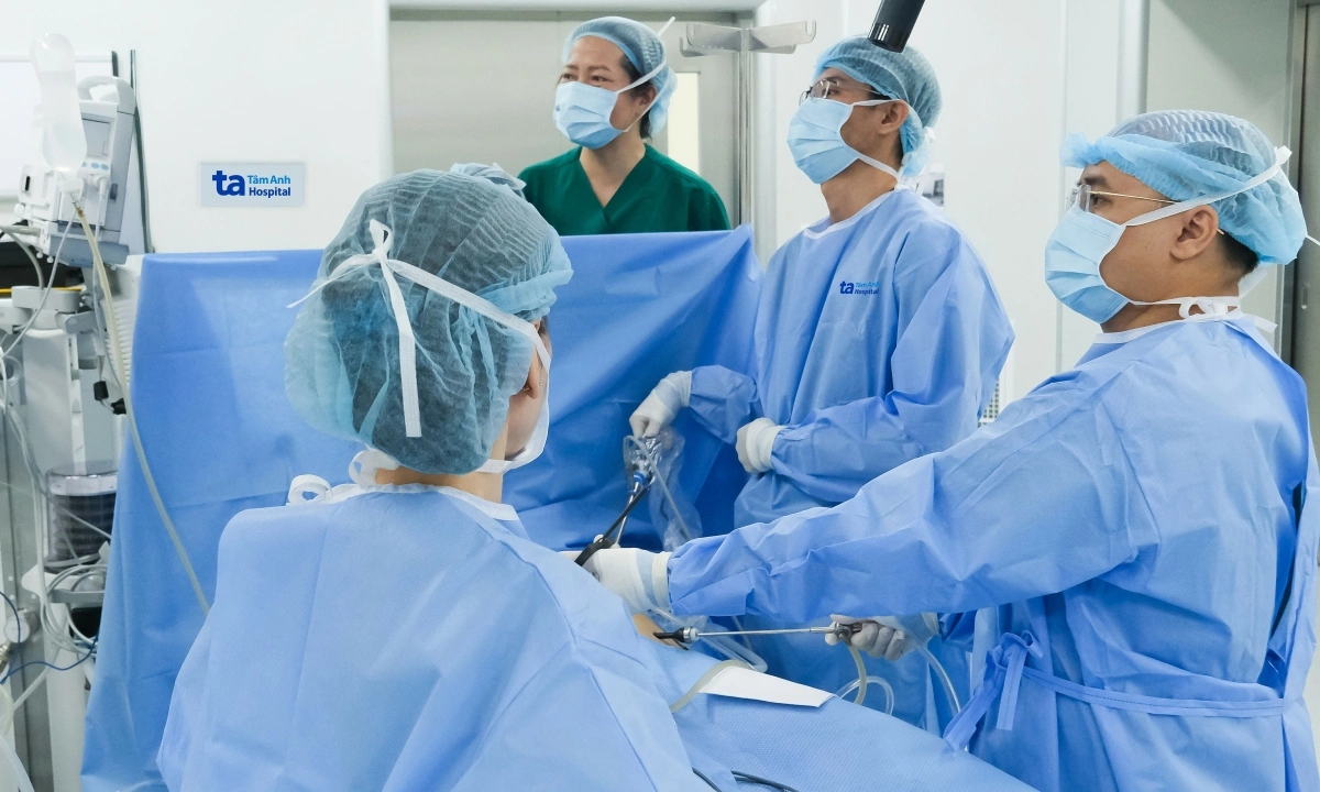 Bác sĩ Vũ (giữa) phẫu thuật nội soi cho bệnh nhi bị viêm ruột thừa. Ảnh: Bệnh viện Đa khoa Tâm Anh