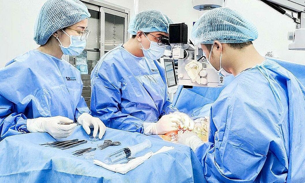 Bác sĩ Vinh (giữa) cùng êkíp vi phẫu tìm tinh trùng cho người bệnh. Ảnh: Hoài Thương