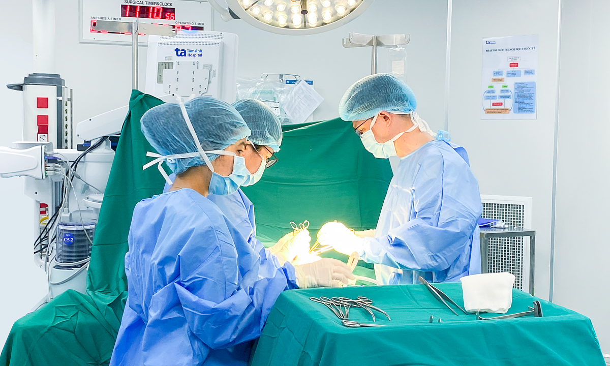 Bác sĩ Tấn và êkíp phẫu thuật cho bà Hân. Ảnh: Bệnh viện Đa khoa Tâm Anh